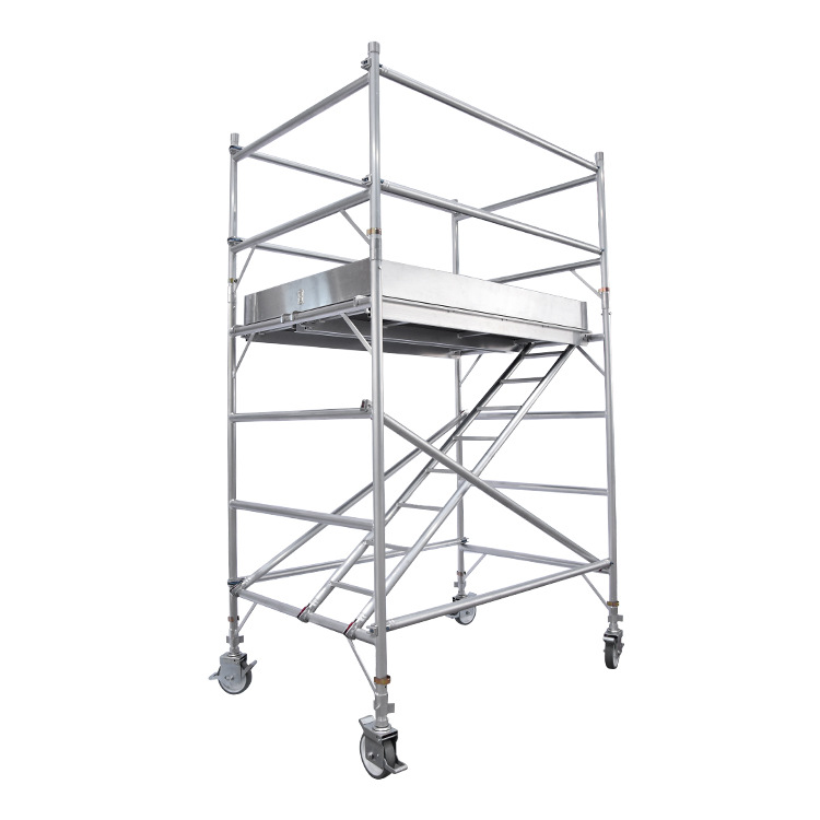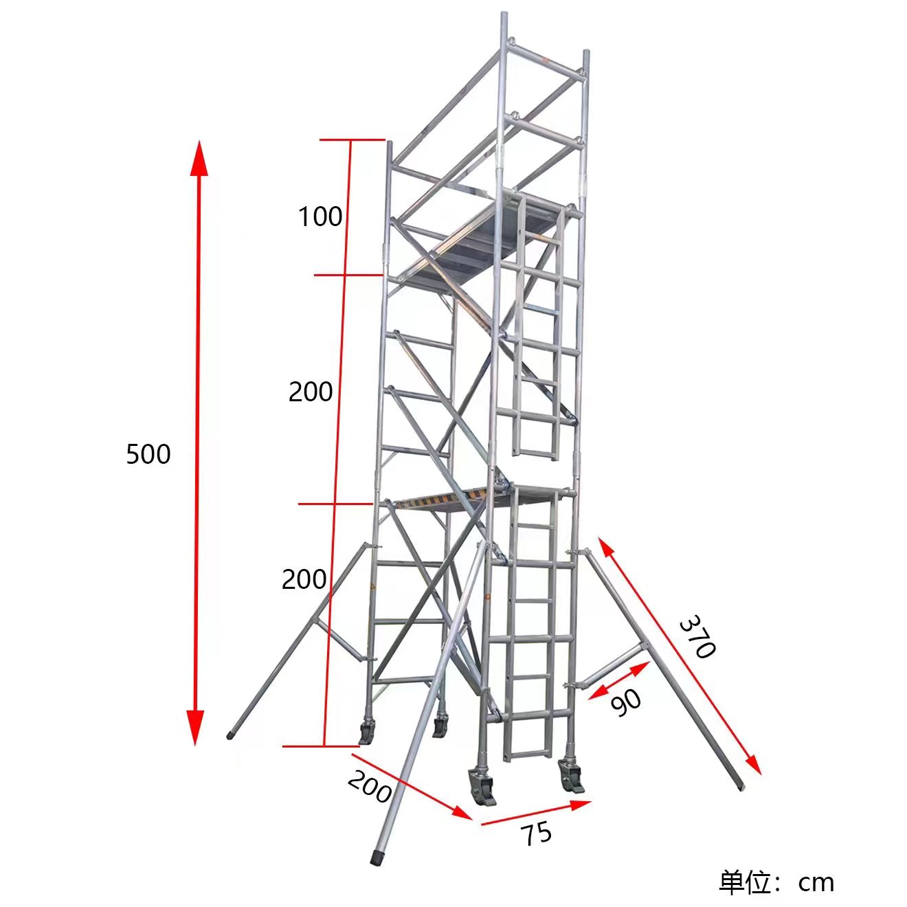 鋁合金腳手架,主要型材為6061-T6和6082-T6,等,常規(guī)尺寸為2m*1.35m寬*2m高,一層高度為2m,可以根據(jù)不同高度而疊層組織使用,寬度,高度等可訂制,配件:防滑舞臺踏板,腳輪,斜撐腳,攀爬梯等為選配