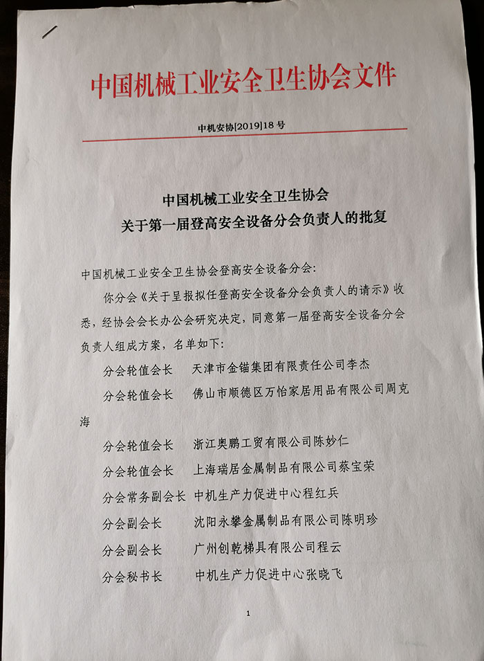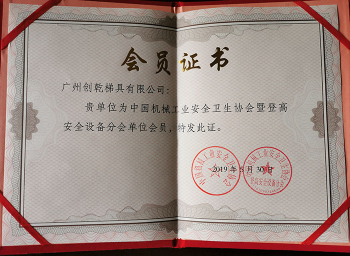 中國機械工業安全衛生協會-榮譽資質-伸縮梯子|折疊梯子|鋁合金梯子|梯子|廣東創乾梯具有限公司