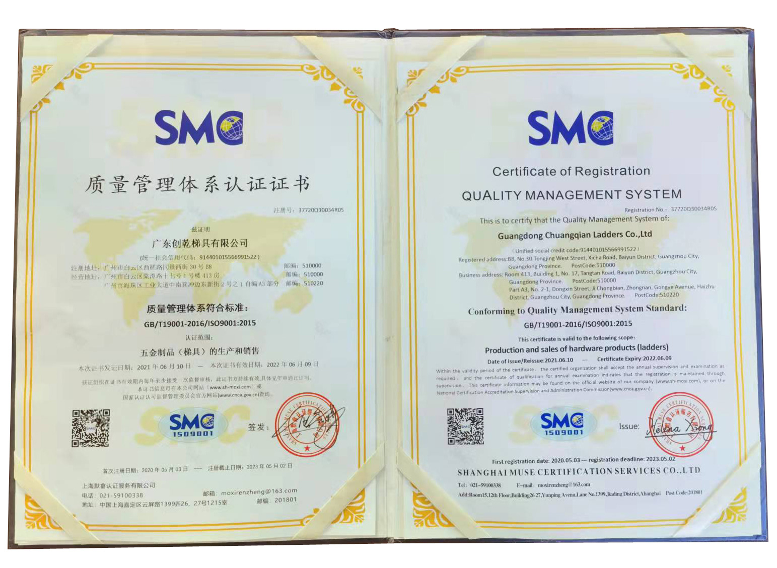 質量管理體系認證證書-榮譽資質-伸縮梯子|折疊梯子|鋁合金梯子|梯子|廣東創乾梯具有限公司