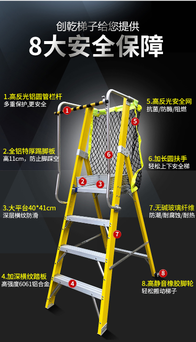 圍欄式平臺梯是屬于安全系數最高的一種梯子,材質有玻璃鋼+鋁合金材質的,承重150kg,有護欄、防護網、踢腳板、防反扣件、外部斜撐、加寬站立平臺等安全部件,此類梯是由扶手人字梯演變而來的,這種重視人身安全的梯子國外非常普及。