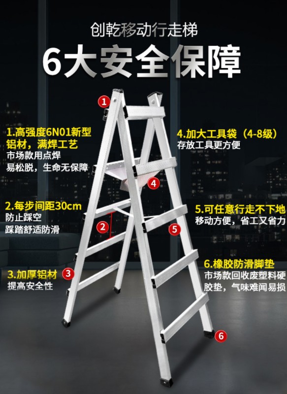 行走人字梯用的都是加厚進(jìn)口航空鋁材,高強(qiáng)度6N01新型鋁材,加大工具袋,任意行瞳不下地,方便又省力。